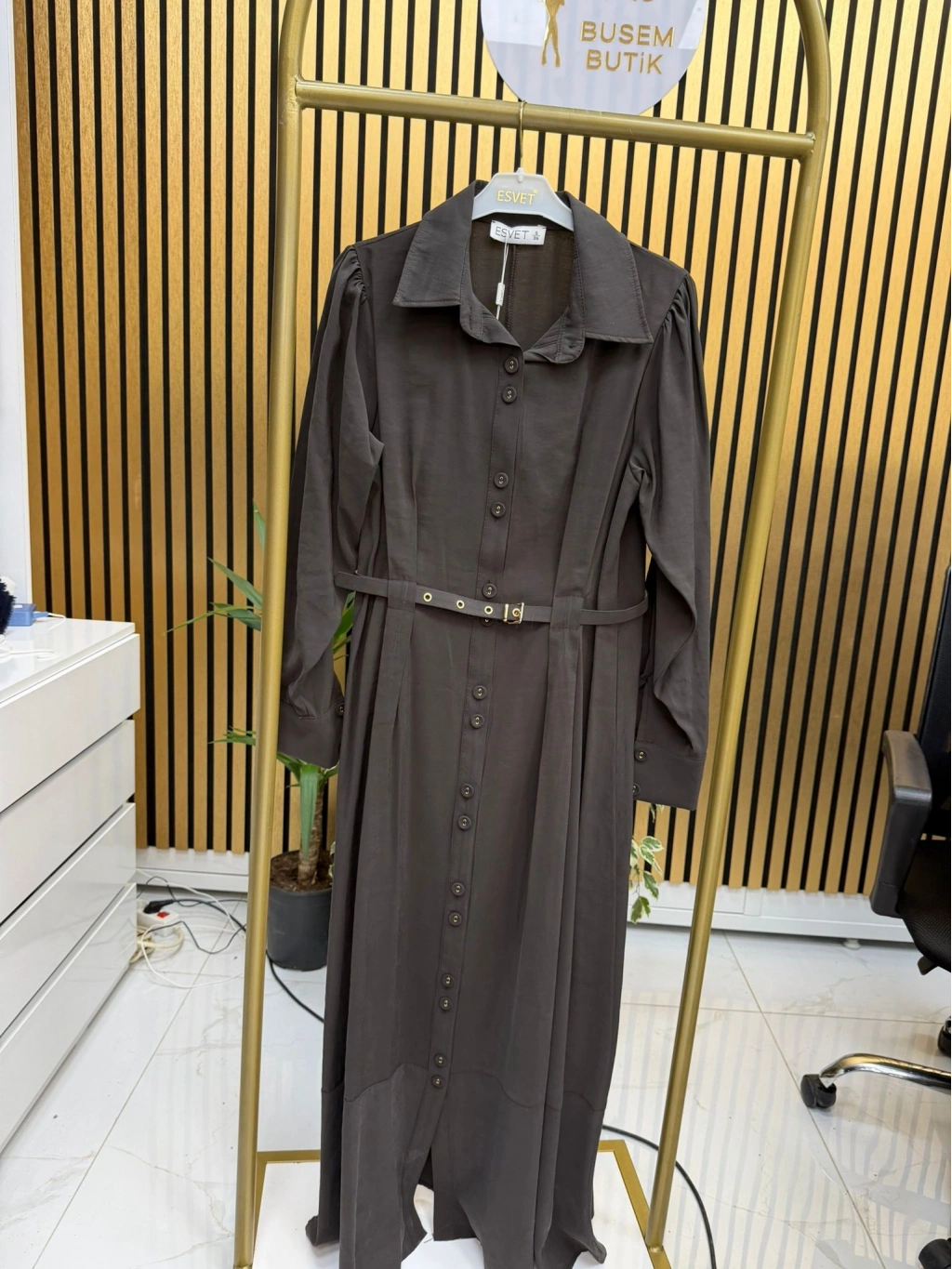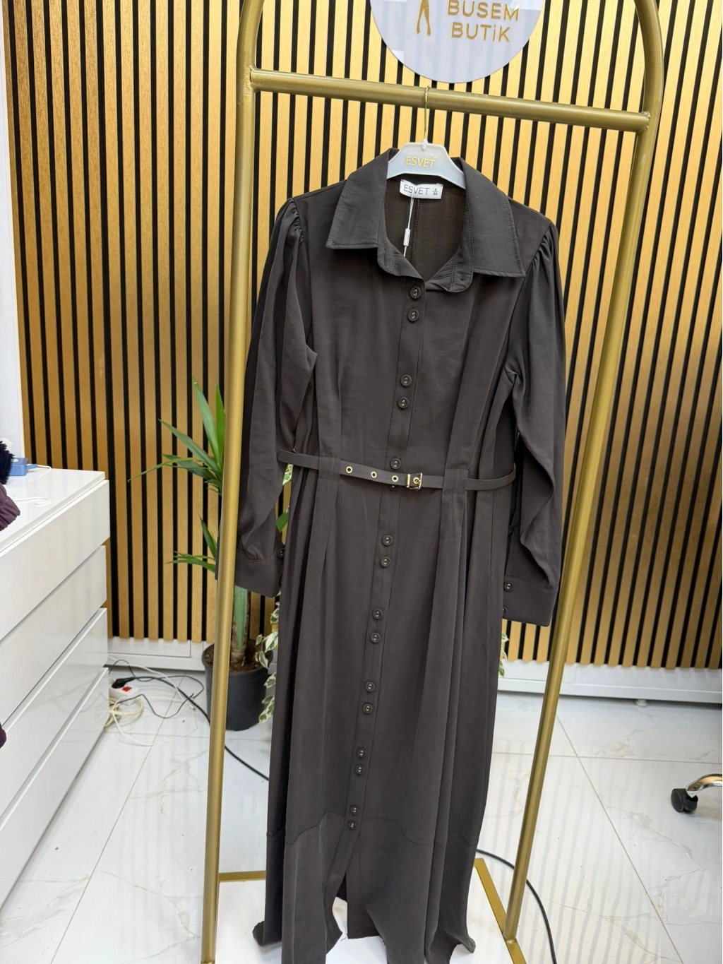 Busem Butik'un şık tasarımı Elegan Luxe Kemer Detaylı Elbise Kahverengi, kemer detayı ve rahat kalıbıyla dikkat çekiyor.