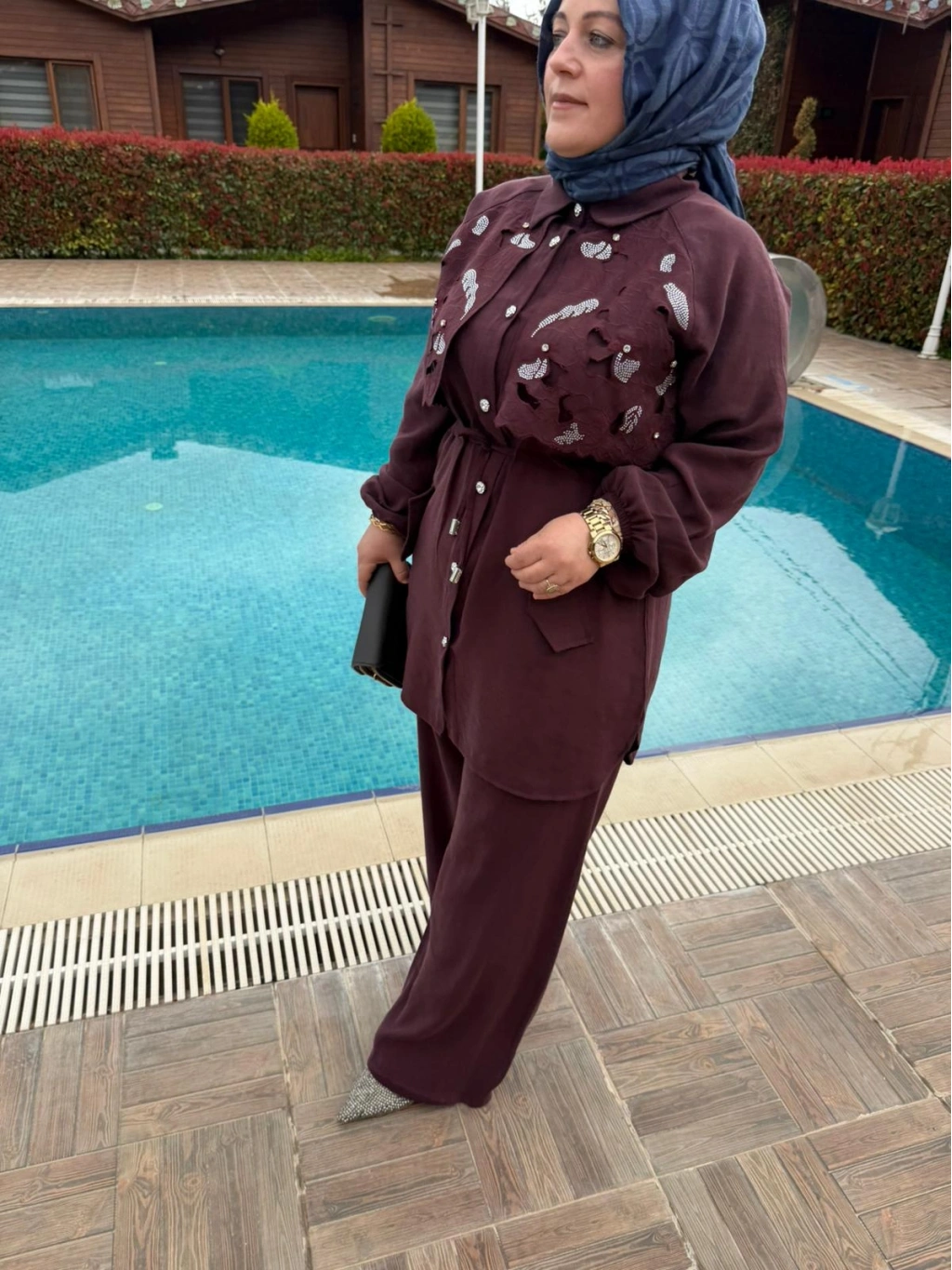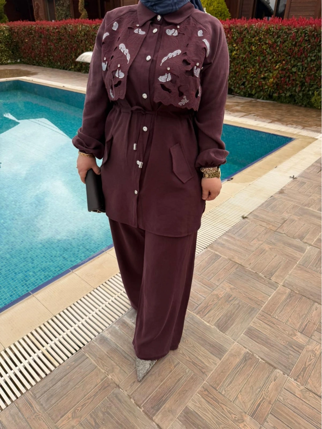 Akıcı kumaşı sayesinde vücutta zarif bir duruş sergilerken, taş işlemeleri kombine sofistike bir hava katar. İster günlük şıklıkta ister özel davetlerde effortlessly şık görünmek isteyenler için ideal bir seçim!