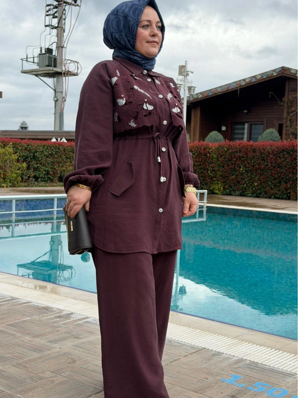 Taş detaylarıyla göz alıcı bir şıklık sunan bu pantolonlu takım, modern ve rahat stilin en zarif hali! İnce düğme detaylarıyla tamamlanan üst parça, sade şıklığı ışıltılı dokunuşlarla ön plana çıkarırken; rahat kesim pantolonu gün boyu konfor sağlar.