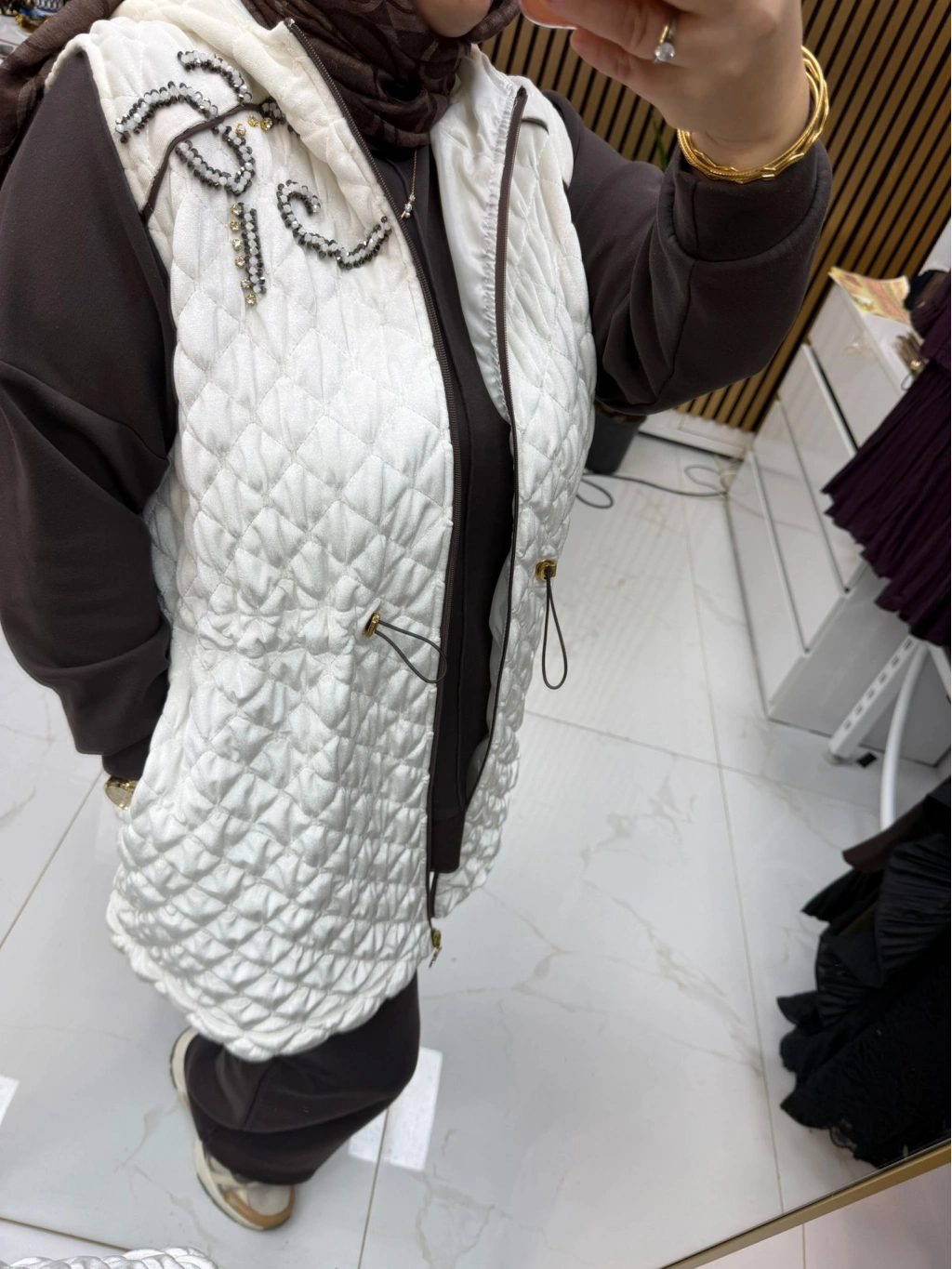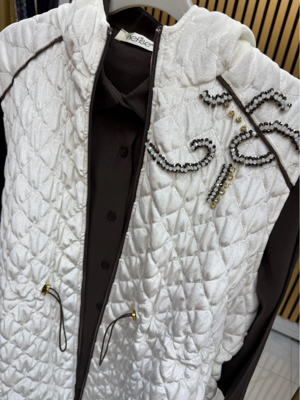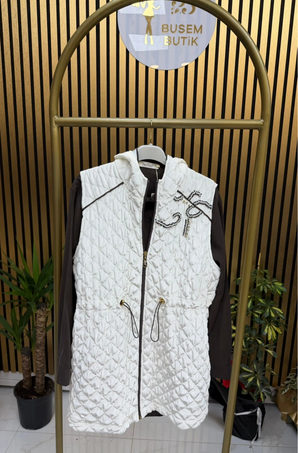 Gardırobunuzun vazgeçilmezi olacak bu yelek, taş detaylarıyla dikkat çeken zarif dokunuşlara sahip. Bel lastiği sayesinde vücuda oturan kesimi ile hem rahat hem de şık bir siluet sunuyor. Fermuarlı tasarımı, pratik kullanım sağlarken stilinize modern bir dokunuş katıyor.